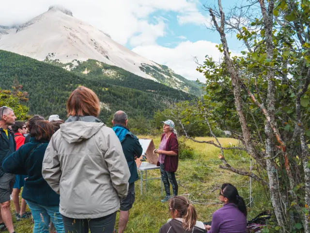 Présentation d’éléments théoriques autour des chiens de protection, puis mises en situation concrètes avec un troupeau et des chiens.