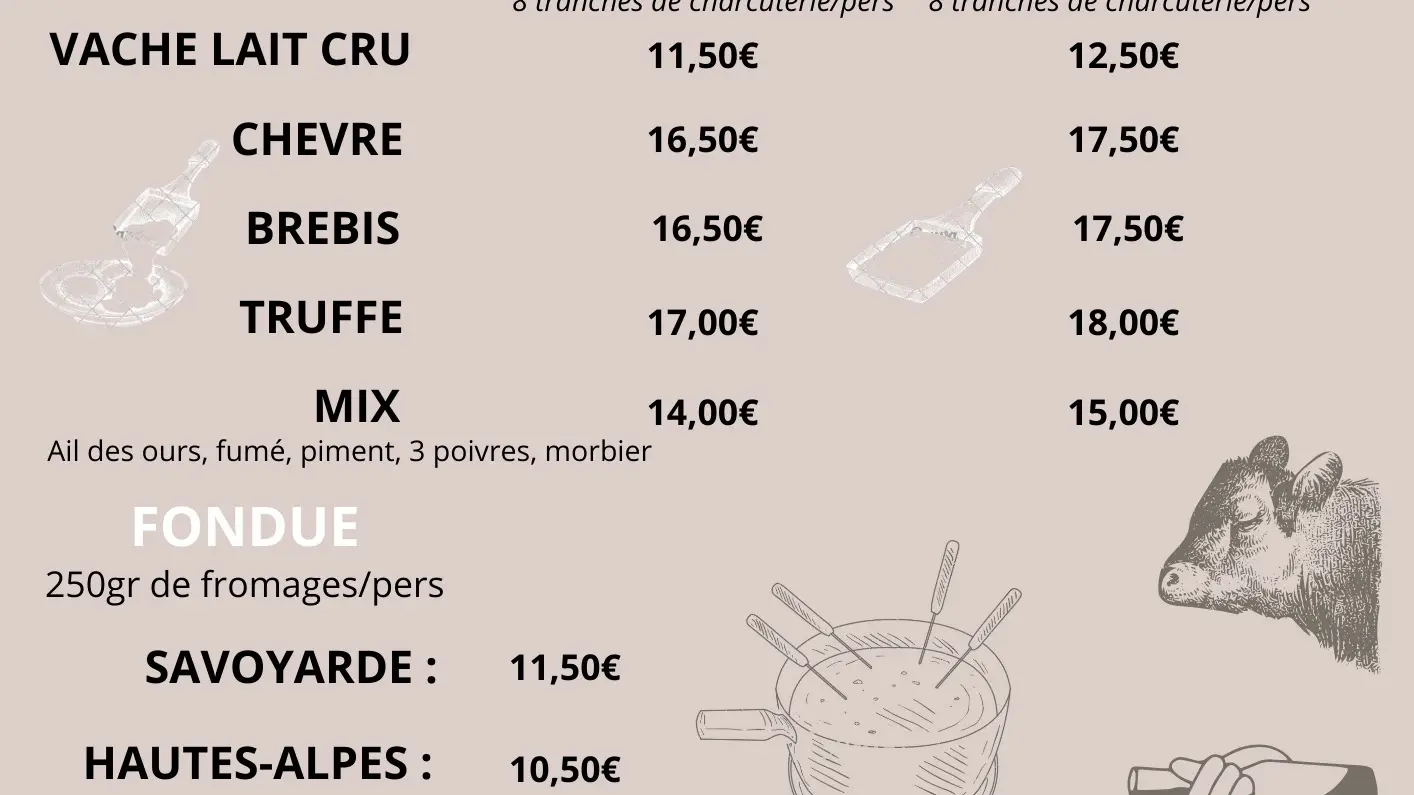Formules raclette/fondue sur commande.