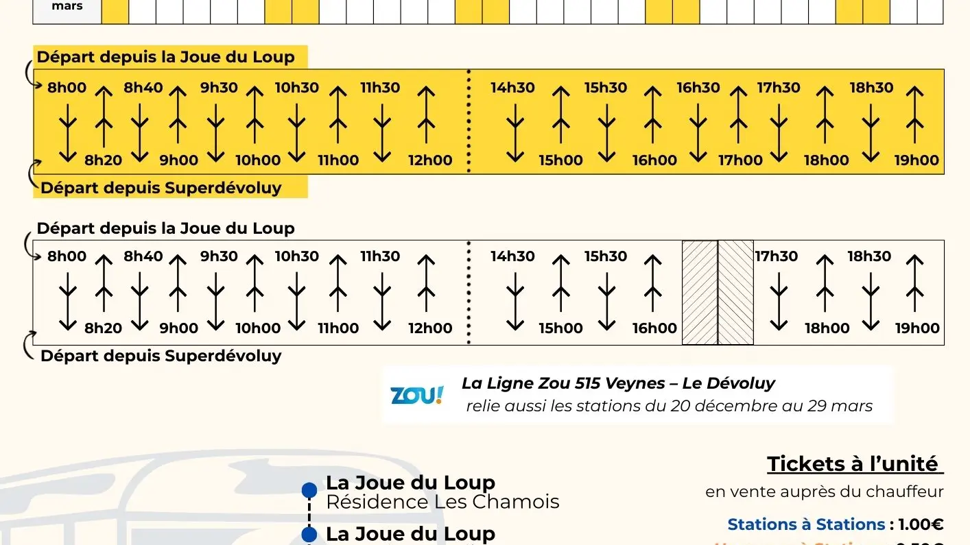 Utile : la navette ZOU 515 (lien disponible en bas de page) opère aussi le trajet entre les stations du Dévoluy, sur des horaires différents. Consultez les horaires de cette ligne pour trouver des horaires qui vous conviennent mieux.