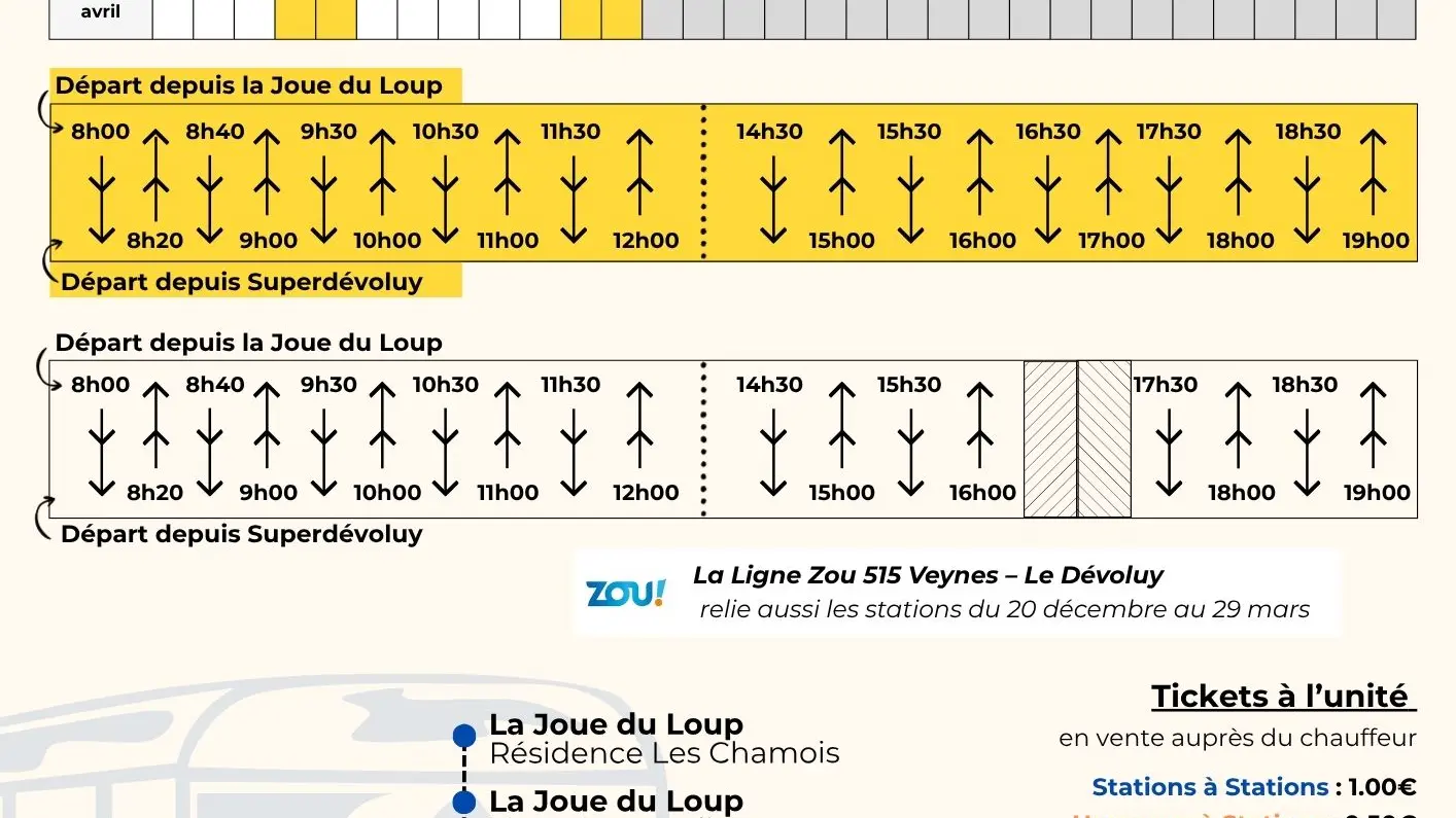 Useful: the ZOU 515 shuttle (link available at the bottom of the page) also runs between the Dévoluy resorts, but at different times. Consult this line's timetable to find a time that suits you best.