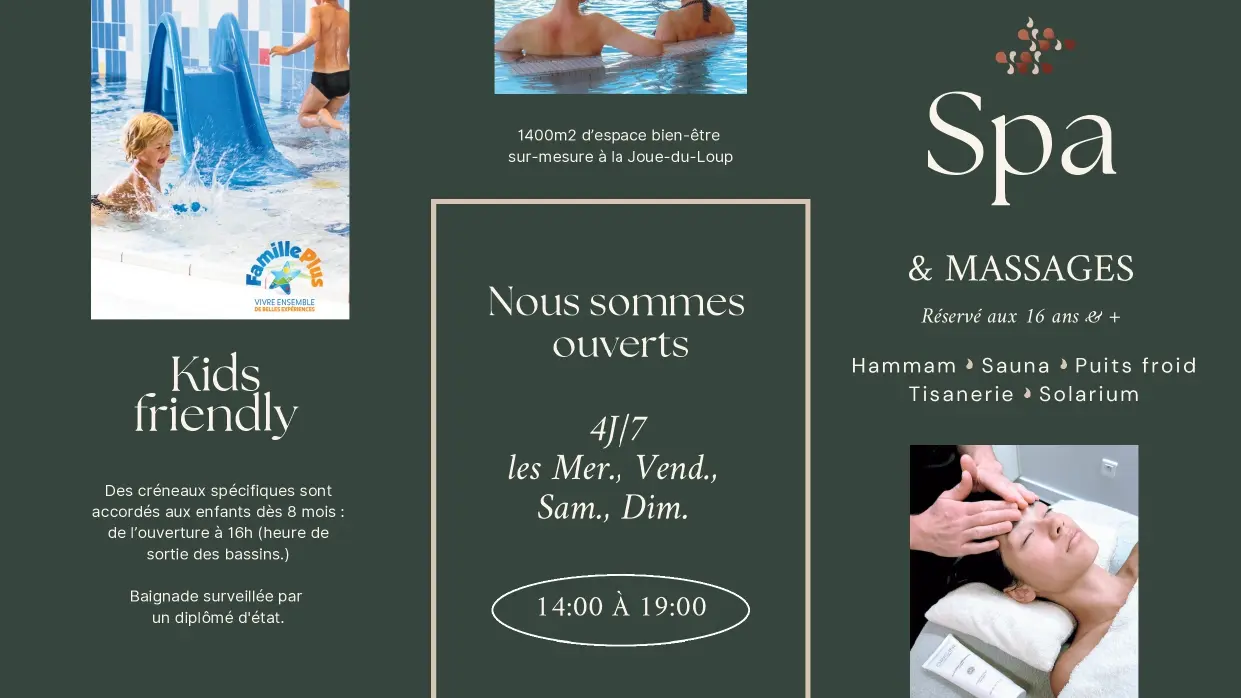 1 SPA area with 2 saunas - 2 hammams - 1 cold well - 1 relaxation room - 1 product sales area - 3 treatment and massage cabins, including 1 duo.