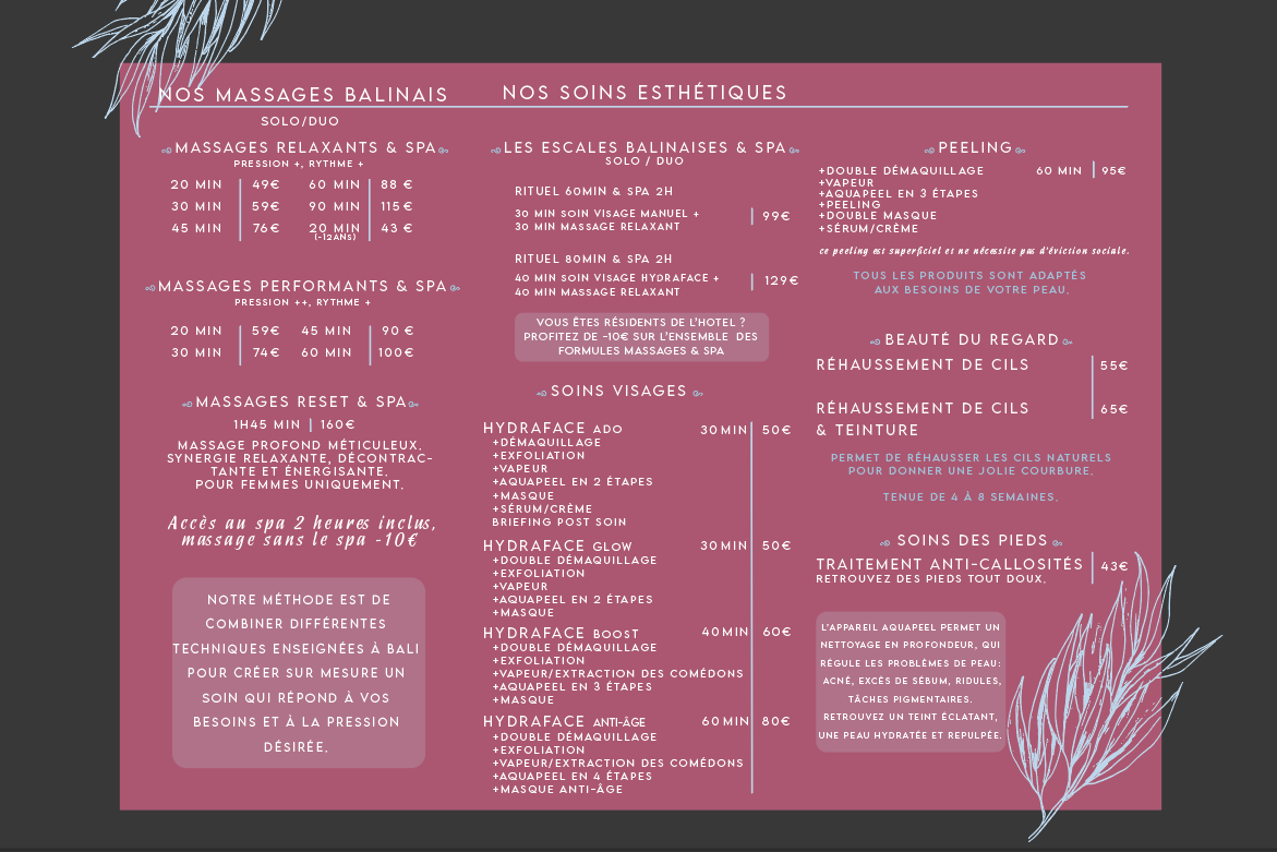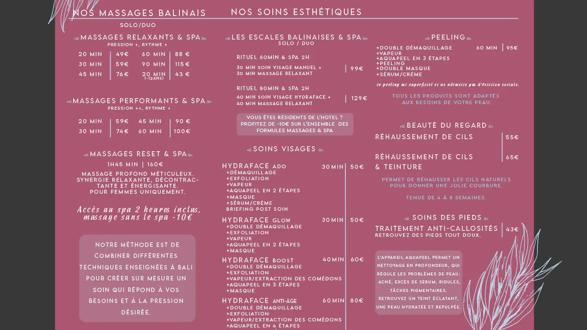 Trakteer uzelf op een moment van welzijn in een betoverende omgeving: ontspannende of verkwikkende Balinese massage op maat, solo of voor twee, met toegang tot de Spa de La Neyrette. Hightech gezichtsbehandelingen, oogverzorging, voetverzorging en nagelsalon.