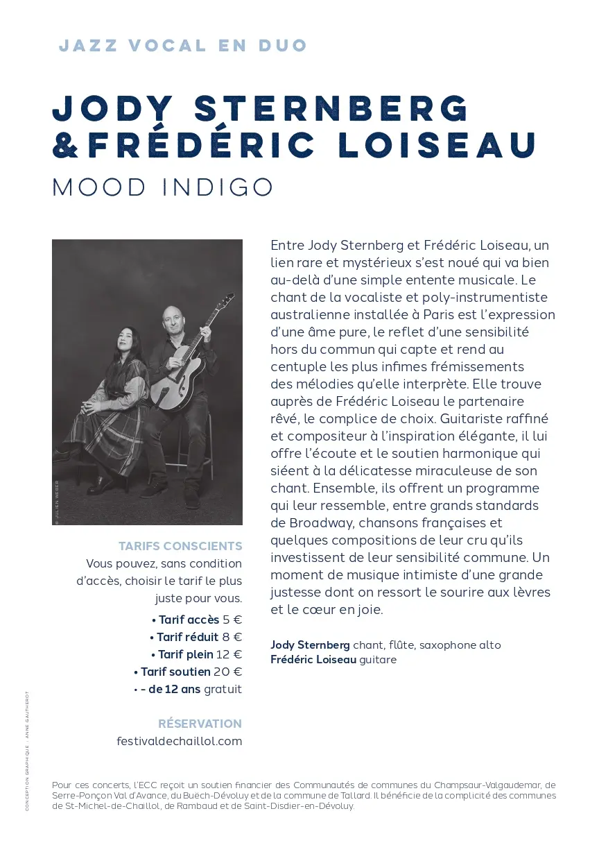 De zang van de in Parijs gevestigde Australische zangeres en multi-instrumentaliste is de uitdrukking van een zuivere ziel, de weerspiegeling van een buitengewone gevoeligheid die de kleinste trillingen van de melodieën die ze vertolkt, opvangt en honderdvoudig weergeeft. In Frédéric Loiseau vindt ze de gedroomde partner, de ideale medespeler. Deze verfijnde gitarist en elegant geïnspireerde componist biedt haar het luisterend oor en de harmonische ondersteuning die passen bij de wonderbaarlijke delicatesse van haar zang. Samen brengen ze een programma dat bij hen past, met grote Broadway-klassiekers, Franse chansons en enkele eigen composities die ze met hun gezamenlijke gevoeligheid invullen. Een intiem muziekmoment van grote precisie, waar je met een glimlach op je lippen en een blij hart vandaan komt.